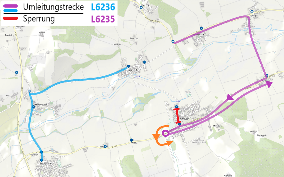 aufgrund einer Vollsperrung der Kreisstraße DGF 32 zwischen Aufhausen und Reichersdorf kommt es im Zeitraum vom 16.03.2026 bis vsl. 30.10.2026 zu Einschränkungen auf den Linien 6235, 6236 und 6259.
