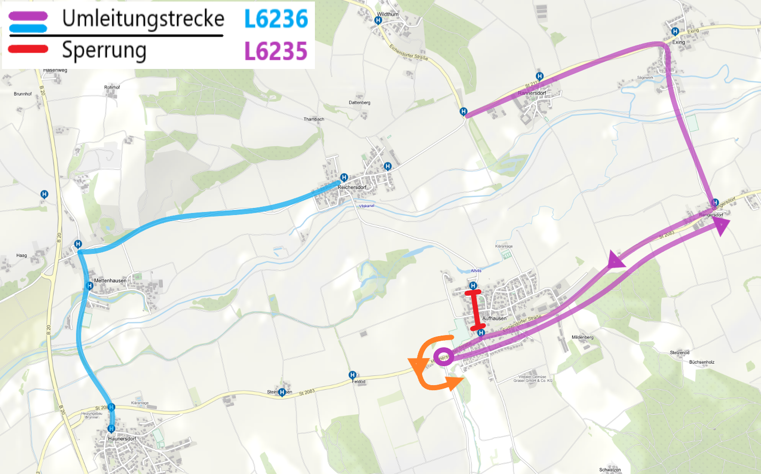 aufgrund einer Vollsperrung der KreisstraĂe DGF 32 zwischen Aufhausen und Reichersdorf kommt es im Zeitraum vom 16.03.2026 bis vsl. 30.10.2026 zu EinschrĂ€nkungen auf den Linien 6235, 6236 und 6259.
