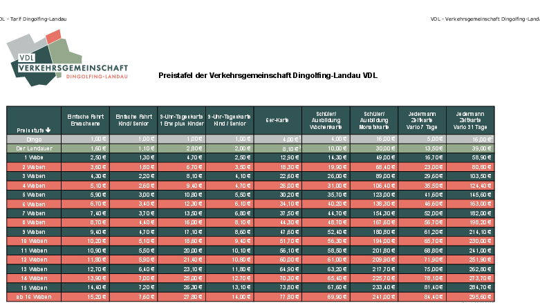 Hier finden Sie die Preistafel der Verkehrsgemeinschaft Dingolfing-Landau VDL.